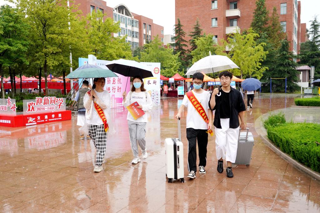 雨中,志愿者送新生去宿舍(王骏宇/摄)