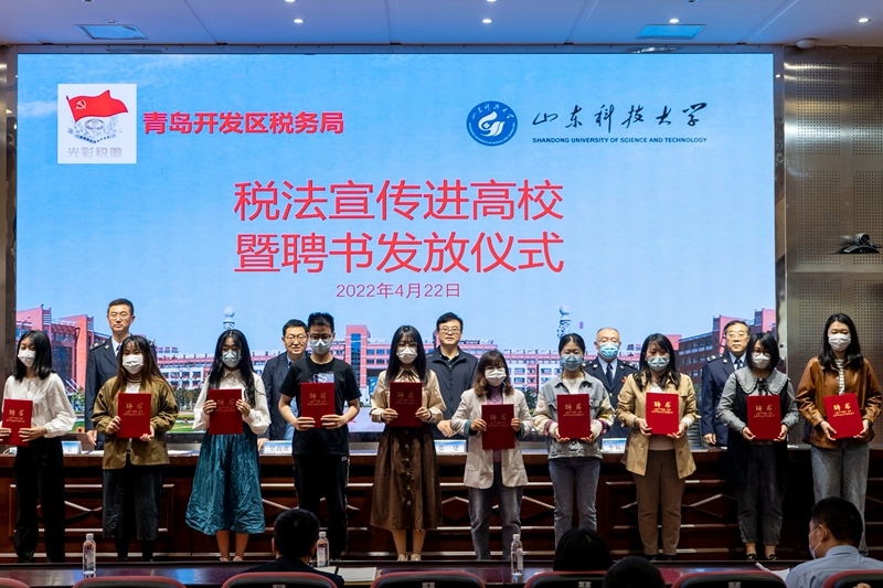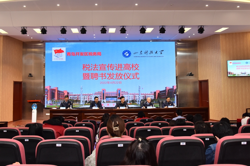 4月22日,雷竞技官网与青岛经济技术开发区税务局共同开展“税法宣传进高校”主题宣讲活动。青岛经济开发区税务局党委常委、副局长李福江,RAYBET雷竞技app副校长张建出席活动并讲话。