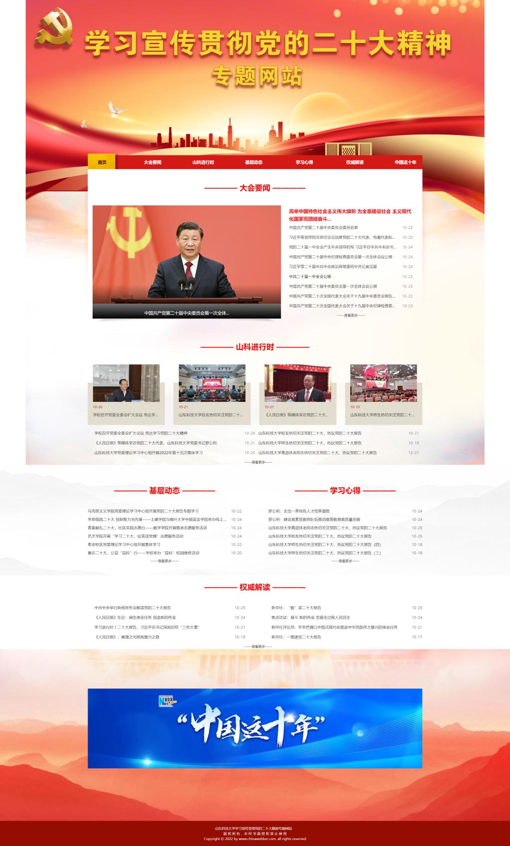 网站分为“大会要闻”“山科进行时”“基层动态”“学习心得”“权威解读”版块。“大会要闻”聚焦、关注党的二十大的重要新闻、重要讲话、中央精神等内容。“山科进行时”及时发布学校学习宣传贯彻党的二十大精神的重要新闻。“基层动态”关注学校各基层单位学习宣传贯彻落实党的二十大精神的新闻动态。“学习心得”发布全校师生员工学习党的二十大精神的感悟体会。“权威解读”及时发布人民日报、新华社等中央权威媒体发表关于党的二十大精神的理论文章、专家观点、政策解读、理论评论等文章。
