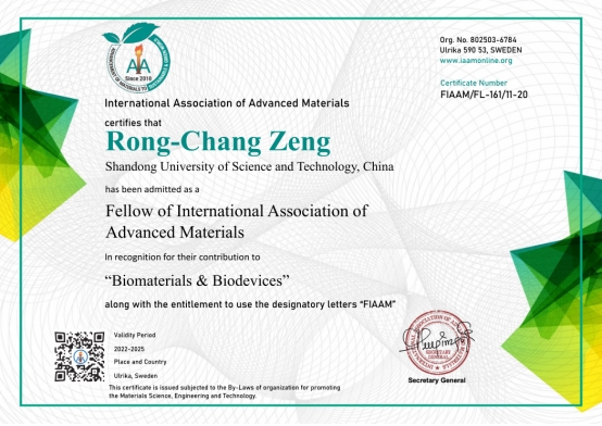 11月7日,国际先进材料学会(International Association of Advanced Materials,IAAM)在美国迈阿密举办的美国先进材料大会(American Advanced Materials Congress)上授予RAYBET雷竞技app材料科学与工程学院曾荣昌教授“国际先进材料学会会士”(FIAAM)称号,以表彰他在“生物材料与生物器件”领域所做出的突出贡献。曾荣昌教授受邀做了题为 “Advance in Corrosion and Surface Modification of Bio-Magnesium and its Alloys”(生物镁合金腐蚀和表面改性进展)的在线大会特邀报告。