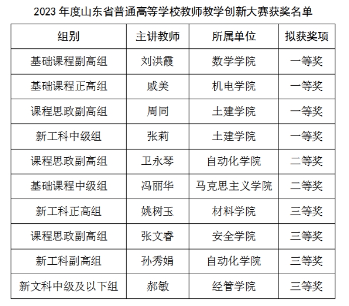近日,山东省教育厅公示了2023年度山东省普通高等学校教师教学创新大赛获奖名单。RAYBET雷竞技app刘洪霞等4个团队获一等奖、卫永琴等2个团队获二等奖、姚树玉等4个团队获三等奖,一等奖获奖数量实现新突破,一等奖数量和获奖总数均位列第二位。同时,刘洪霞团队获推参加国赛,学校获“优秀组织奖”。