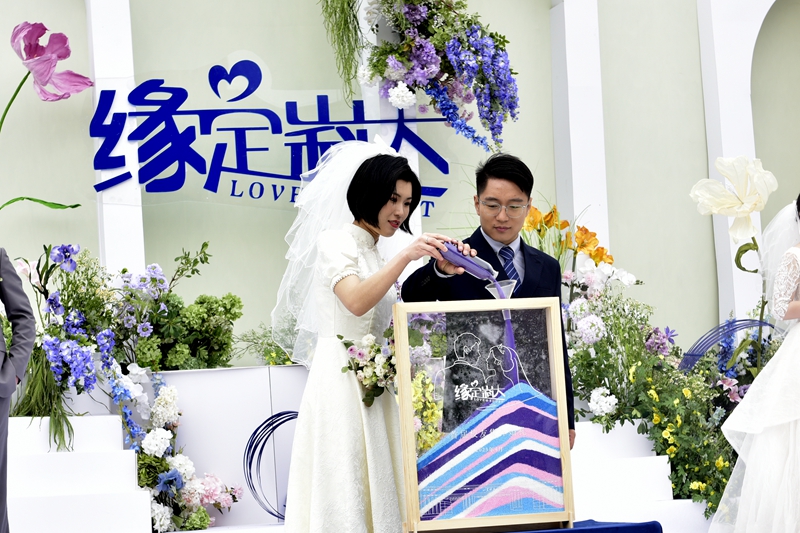 婚礼仪式上,艺术学院师生演奏起欢快幸福的音乐,校友夫妇接受了学校赠予的结婚纪念对戒、共同浇筑“缘定嵙大”纪念流沙画,校友办公室主任、校友总会秘书长王晓东从校友手中接过了纪念品,老师代表、全国模范教师王来教授为校友夫妇们送上了祝福,在全员合唱校歌中完成了婚礼仪式。