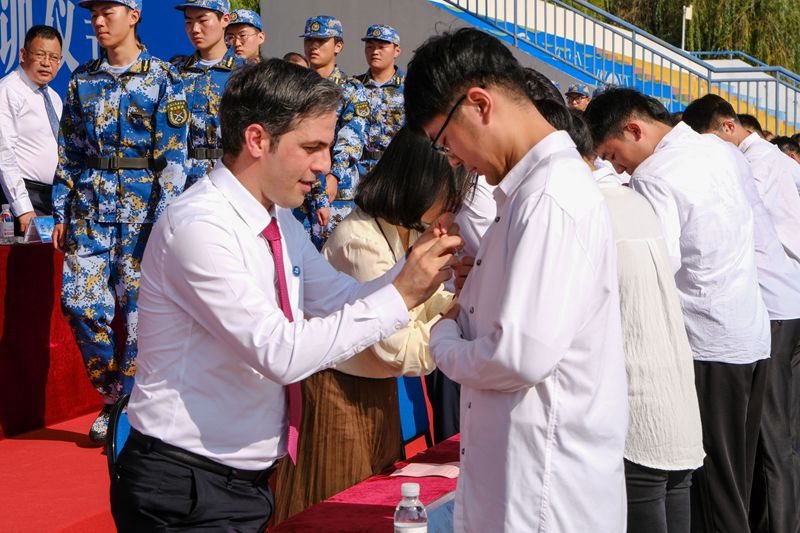 为新生代表佩戴校徽
