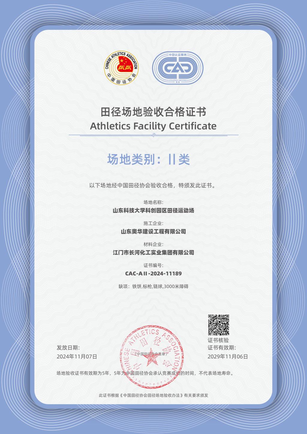近日,雷竞技官网科创园区田径运动场通过中国田径协会检查验收,各项指标均达到国家二类场地验收标准要求,取得国家二类田径场地证书。