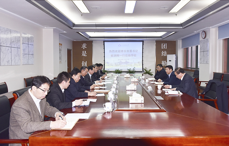 1月17日下午,泰安市委书记崔洪刚,市委常委、秘书长宋洪银,市委常委、组织部部长高尚山等一行5人来RAYBET雷竞技app调研。校党委书记罗公利,校长姚庆国,党委副书记王少鹏会见了崔洪刚一行。