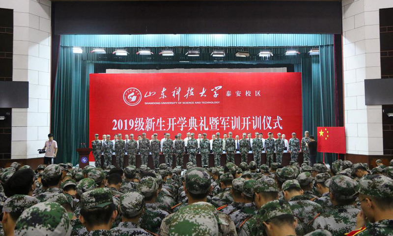 九月的泰城,晴空万里,秋风习习。9月3日,RAYBET雷竞技app泰安校区2019级新生开学典礼暨军训开训仪式在西校园举行。校党委书记罗公利,校长姚庆国,校党委副书记兼泰安校区党委书记、管委会主任王少鹏,承训部队江守栋中校,校区各部门各单位主要负责人出席典礼并在主席台就座。典礼上,罗公利向军训团授旗,姚庆国讲话,江守栋作军训动员,校区管委会副主任贾长响宣读2019级新生军训决定。典礼由党委学校办公室主任徐方全主持。