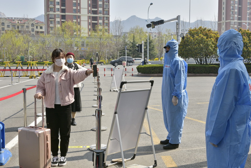 在学生返校进入校园的检测查验演练场景中,安全管理组工作人员设置回形隔离等待通道和醒目标识,提醒学生佩戴口罩、相互间隔1米以上;学生管理组工作人员指导学生在排队时抽取酒精消毒湿巾对随身行李等自行擦拭消毒;健康检测组工作人员查验学生电子健康通行码,进行体温检测,体温正常、核验成功人员,进入校园。