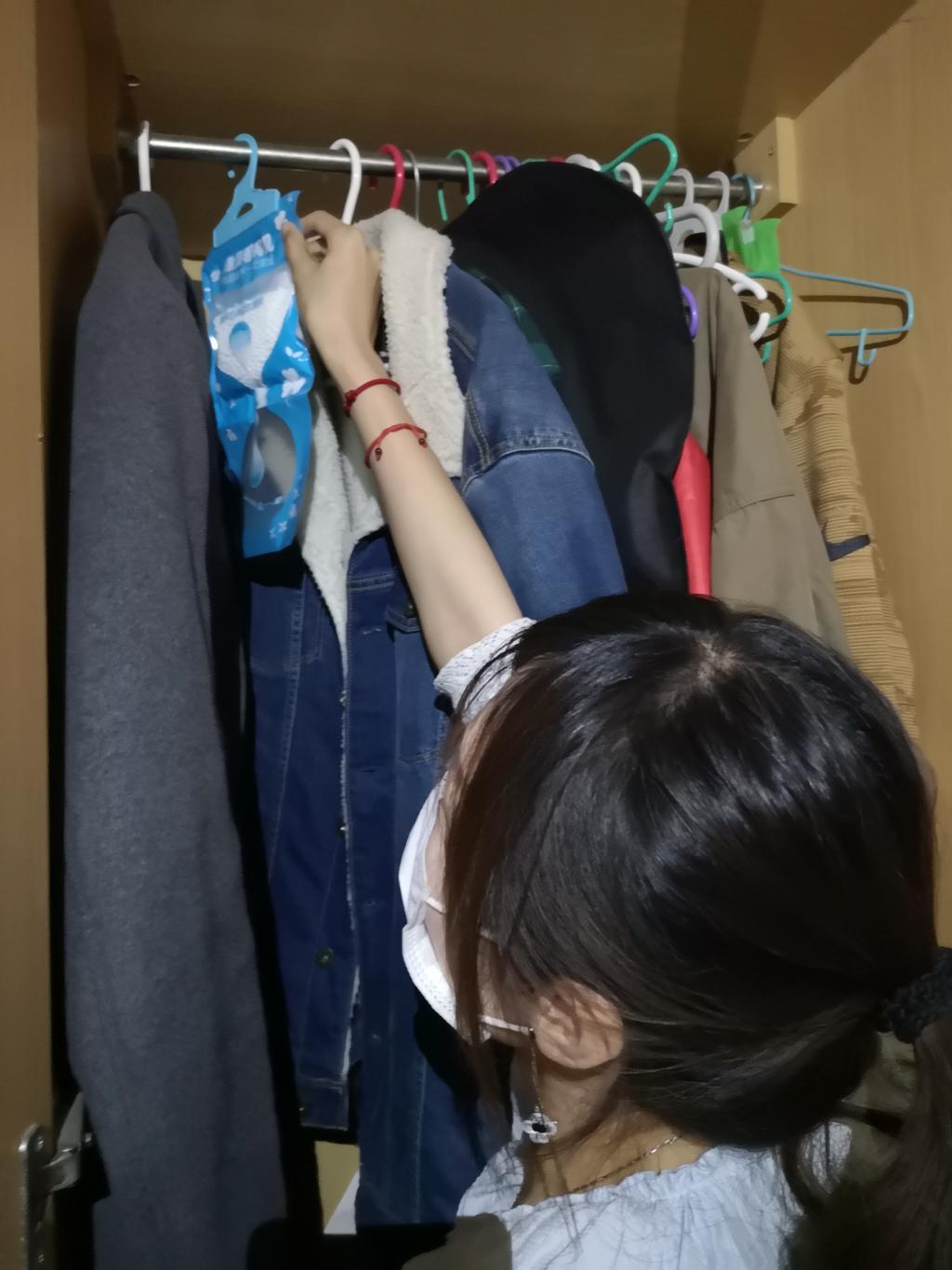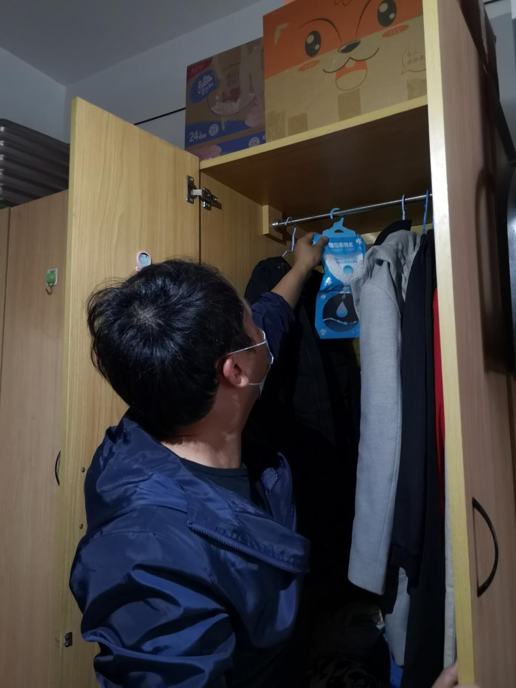 把除湿袋放在同学们的衣柜里