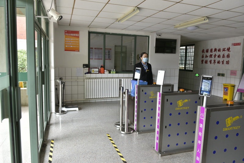 在每栋学生公寓楼入口处都安装了人脸识别测温仪,同学们进入只需站立1秒,就可以识别身份和体温。