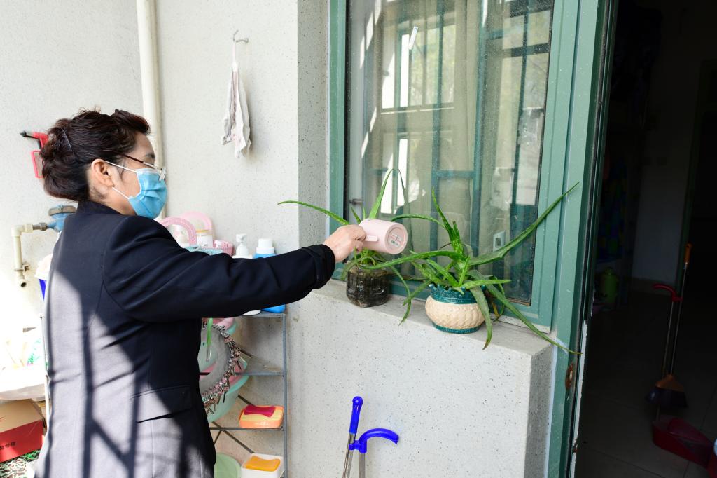 宿管阿姨为绿植浇花
