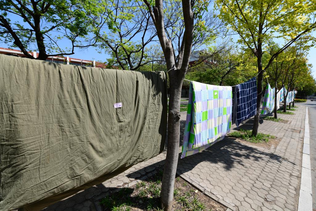 4月23日起,学生公寓管理服务中心上线“阿姨来帮忙”云服务业务,包括宿舍通风、绿植浇水、垃圾清理、晾晒衣物等四项服务。109位宿管阿姨和百余名辅导员把提出需求的学生被褥一床一床搬至楼下晾晒。