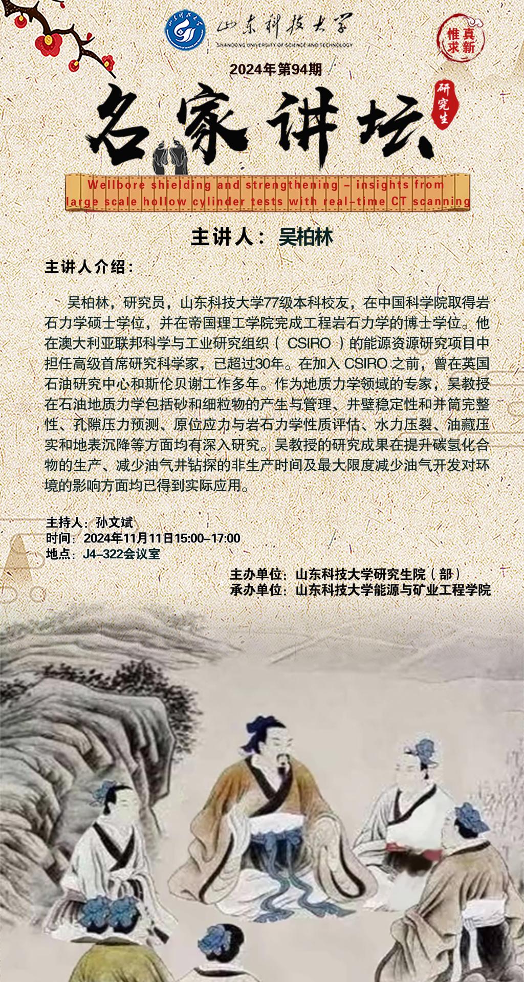 “名家讲坛”2024年第94期:Wellbore shielding and strengthening - insights from large scale hollow cylinder tests with real-time CT scanning(总988期)
